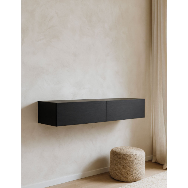 Wykonana z naturalnego forniru dębowego barwionego na głęboki odcień czerni, zachowuje widoczne usłojenie, dzięki czemu łączy surowość nowoczesnego designu z ciepłem drewna. Konsola nie posiada nóg – jej wisząca konstrukcja nadaje wnętrzu lekkości i ułatwia utrzymanie czystości.