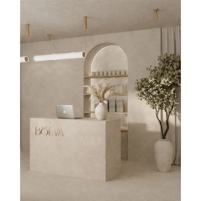 Recepcja RAYS to nowoczesna recepcja zaprojektowana do przestrzeni, w których liczy się minimalizm, elegancja i spójny wizerunek marki. Prosta, monolityczna bryła w jasnym kamiennym dekorze.