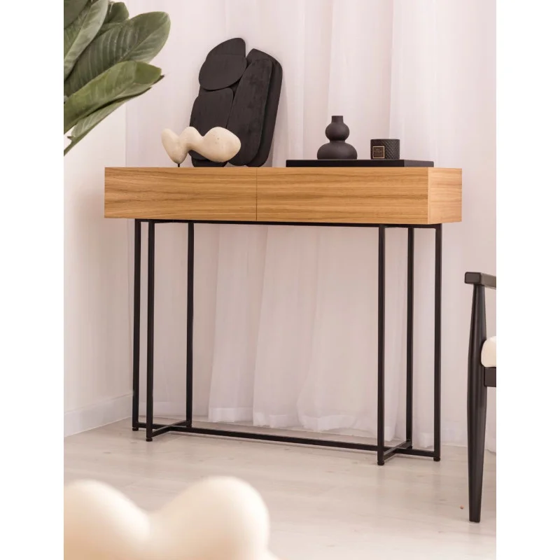 Korpus wykonany z naturalnej płyty fornirowanej dębem prezentuje się wyjątkowo ciepło i stylowo, a czarne, proste nogi z metalu dodają jej lekkości oraz nowoczesnego charakteru. Dwie szuflady ukryte pod fornirowanym frontem pomieszczą drobiazgi, które chcesz mieć pod ręką – od kluczy po kosmetyki.