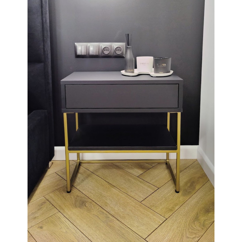 Blat i front szuflady wykonane są z wysokiej jakości materiałów, które gwarantują trwałość i odporność na codzienne użytkowanie. Subtelne, złote uchwyty oraz nóżki nadają meblowi lekkości i delikatnego blasku, dodając sypialni wyjątkowego charakteru.