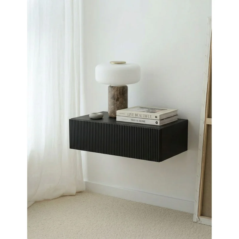 KENDRA to czarna, podwieszana szafka nocna z szufladą, która łączy funkcjonalność z elegancką formą i wyrazistym ryflowanym frontem.