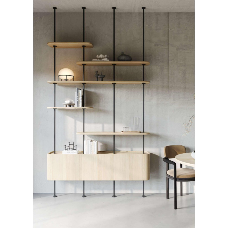 Regał AIDA to nowoczesny regał rozporowy, który łączy funkcjonalność z wyjątkową estetyką. Wykonany z czarnego forniru dębowego, zachwyca głębokim, matowym wykończeniem, które nadaje wnętrzu wyrafinowany charakter. Dzięki innowacyjnej konstrukcji rozporowej montaż odbywa się bezinwazyjnie – specjalne rozety stabilizują regał między podłogą a sufitem, eliminując konieczność wiercenia.