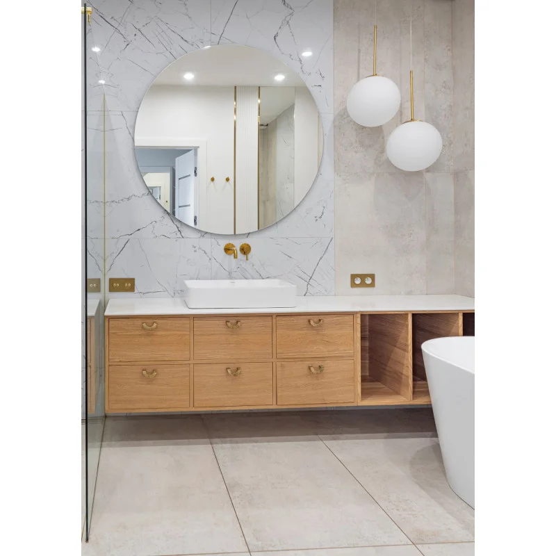 - Naturalne fornir dębowy: Wytrzymały i szlachetny materiał, który wprowadza ciepło do Twojej łazienki.