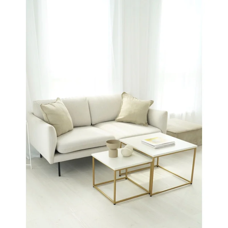Białe blaty wykończone naturalnym fornirem dębowym to połączenie elegancji i praktyczności. Struktura drewna jest subtelnie widoczna, co nadaje stolikom charakter i naturalny wygląd. Złota metalowa podstawa dodaje całości lekkości, nowoczesności i ponadczasowego stylu.